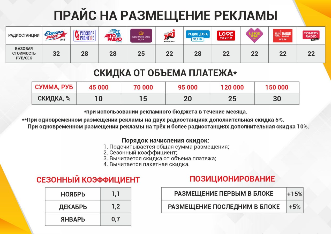 | Стоимость руб./сек. | 32 | 28 | 28 | 25 | 22 | 28 | 22 | 22 | 22 | 22 |